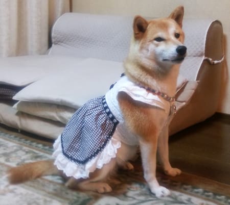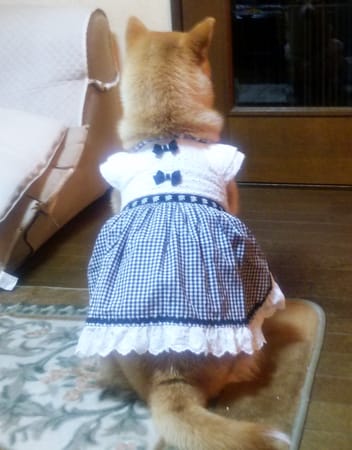 柴犬は服を嫌がります。着せやすいように、前あきにしてマジックテープで留めるようにしています。