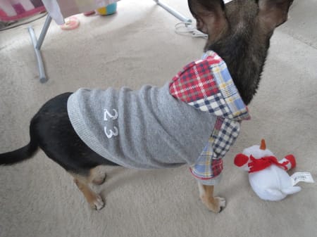 パーカーのフード付きを作りました。男の子の赤、可愛いですよね~