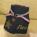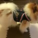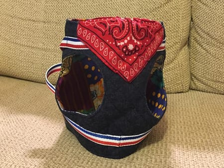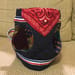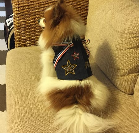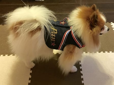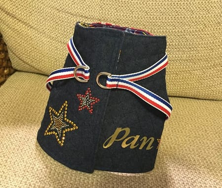 表布と裏布各1枚ずつのシンプルな型紙でびっくりしましたが、シンプルゆえに作りやすく、ごわつきがないから愛犬も装着しやすそうです。ラインストーンの星柄アップリケとお名前をアイロンプリントし、前身頃にはバンダナをつけてアクセントにしました。