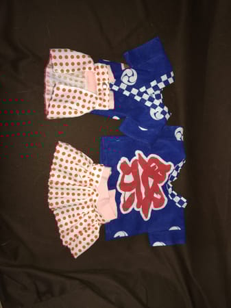 妻の代理アップです。 サロペットのスカートをフレアスカートに変更しました。 フレアスカートとハッピの生地は100均の手ぬぐいです。