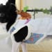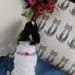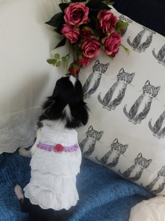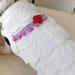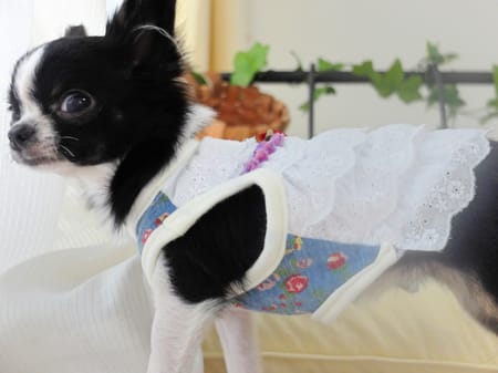 綿レースを使ってドレス風に仕上げました。黒いわんこに白いレースが映えます♥ アクセントはパープルのフリルと真赤な薔薇です。