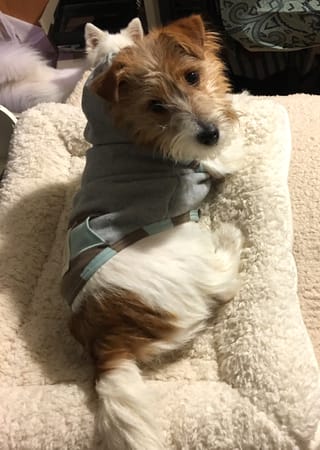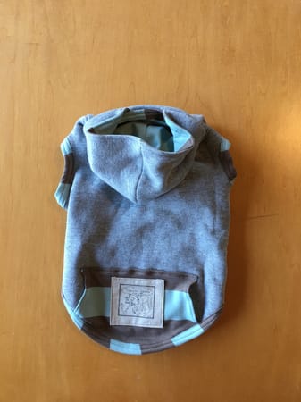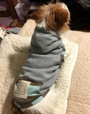 秋用に裏起毛の布地で作りました。ポケットに布プリ(自分でイラストを描きました)を縫い付け、グンといい仕上がりになりました。