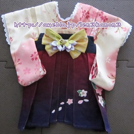 グラデーションの生地をお店で見つけたときに絶対に袴にしようと思いました。頑張って、桜の刺繍も。雰囲気出ているかな?