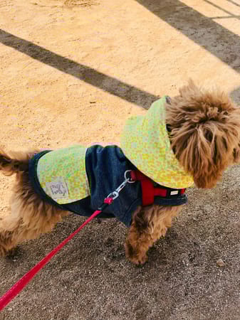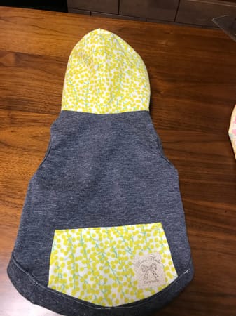 120子供服をリメイクして作ったタンクトップに、ダブルガーゼとボア生地でフードとポッケをつけました。