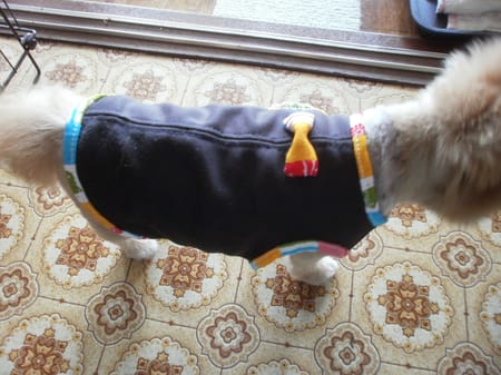 ズボンのハギレから作りました。こちらの型紙を使って作成しましたので、うちの子の体にフィットしています。