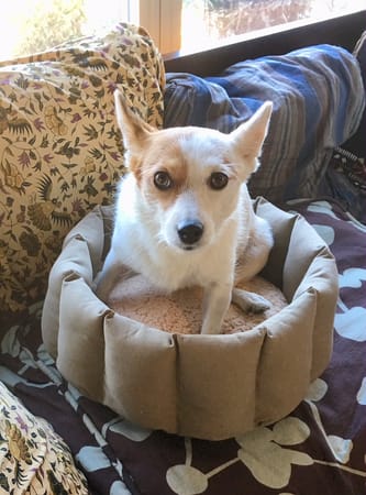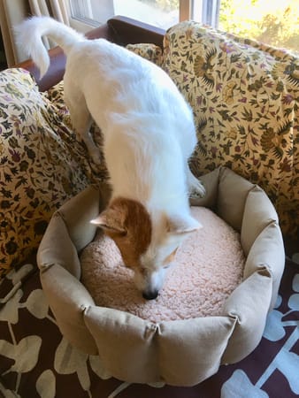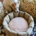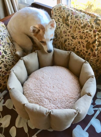 小さめのベッドで丸まって寝るのが好きな子だから、ラウンドベッド型紙中サイズを87%縮小しました。サークルに入れやすいサイズという理由もあり。外回りは倉敷デニムの硬めの生地で、クッション部分はふわもこ生地で。オシッコしても沁みないよう透湿性防水シートを中に挟んでいます。