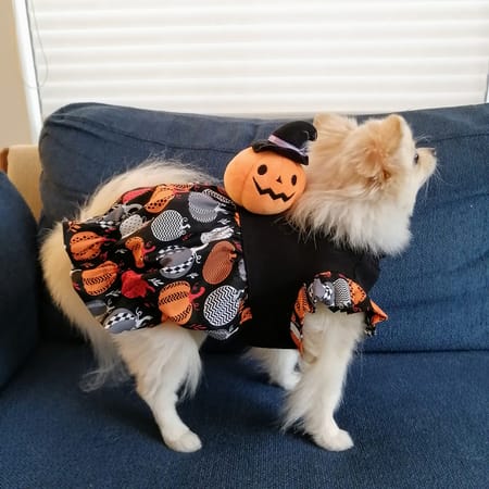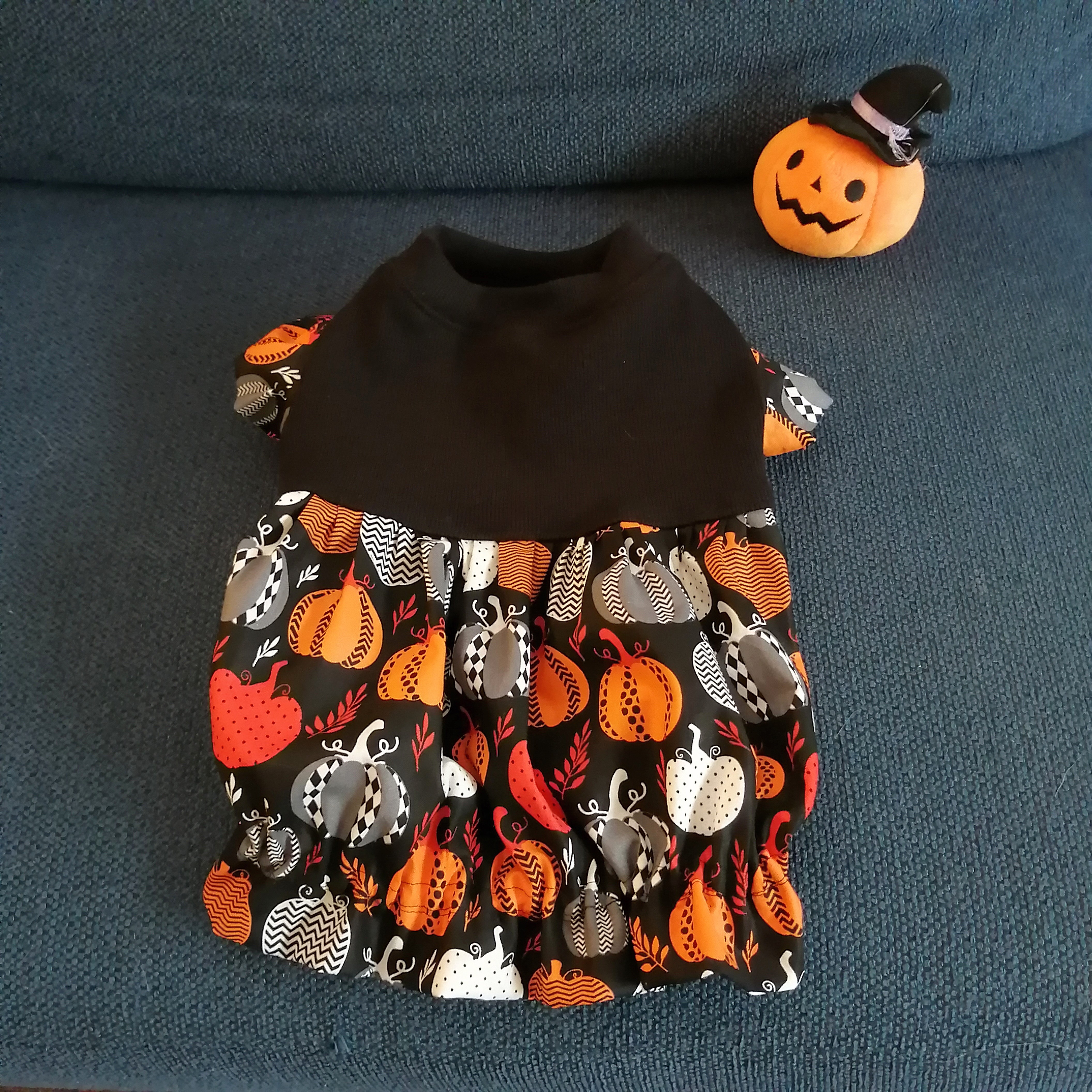 このカボチャ柄の生地に一目惚れして、ハロウィンにピッタリの犬服を作りました。スカート部分はボリュームたっぷりのバルーン(カボチャ)型に。無料タンクトップの型紙をアレンジした作品です!