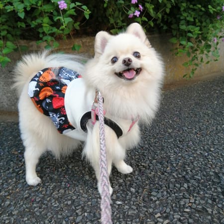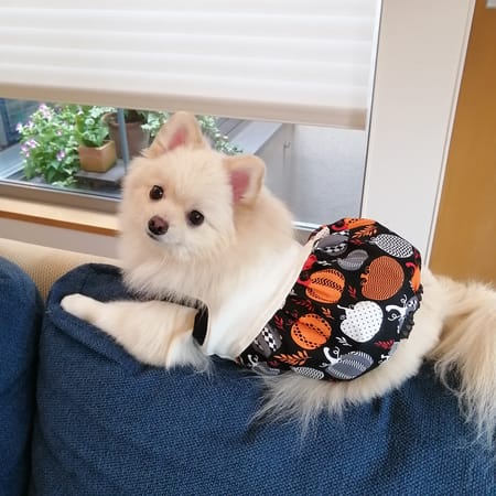 10月のお散歩はカボチャ柄! 見頃はハーネスが付けやすいようにシンプルに。 スカートはカボチャのようにバルーンに!!