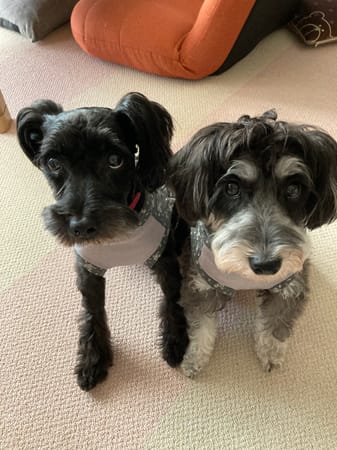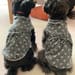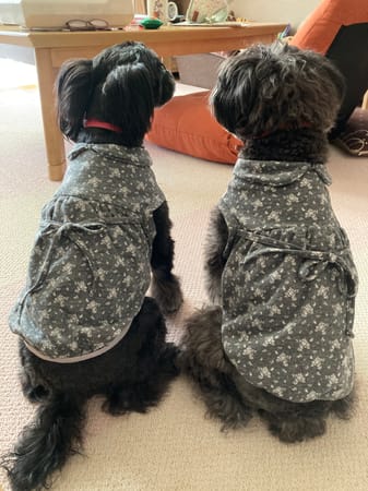 ニット生地のワンピースのリメイク。 リボンはワンピースのをカットして利用♪ 前見頃は子どもたちのTシャツをリメイク! 2わんお揃いで。