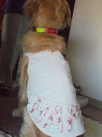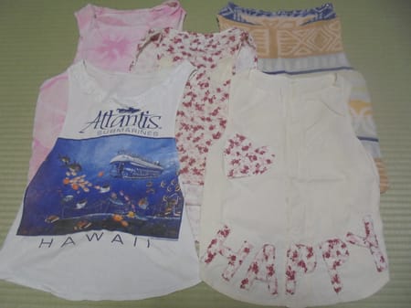 愛犬ハッピーのために作ったタンクトップ5種類です。 Tシャツ、パンツ、バスタオルなどのリメイク品です。