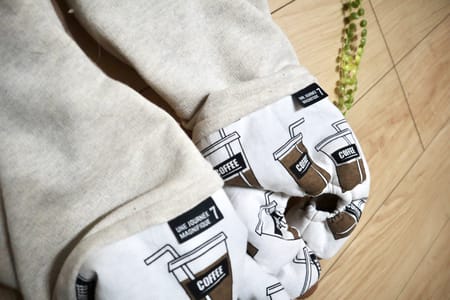 コーヒー柄×ボーダーのオーバーオールを( * ॑˘ ॑* ) ⁾⁾
