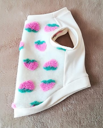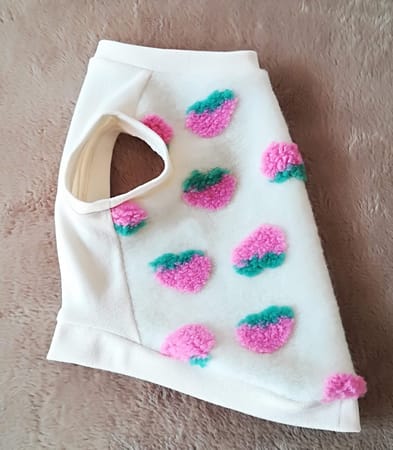 基本のタンクトップ。Sサイズに挑戦。前後ともボアにすると伸縮が弱く脱ぎ着しにくいので、前見頃はスムースニットで作りました。