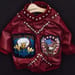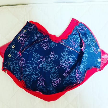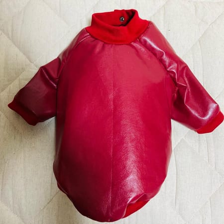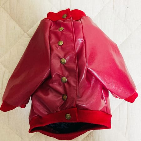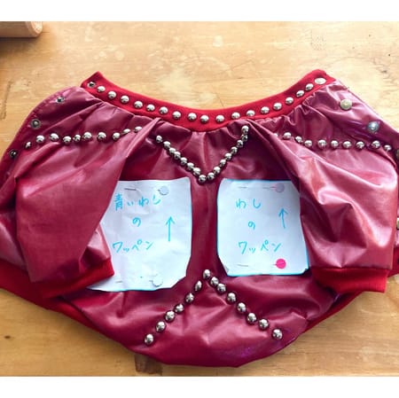 試作を3回重ね、合皮の生地で、作りました。前見頃を半々に切り、十兵衛の胸幅に合うサイズに広げて前ボタン式にしました。ボタンはカシメボタンで打ちつけました。あと、ワッペン二つを手縫いで縫い付け、玉飾りスタッズを専用の工具でデザインして作りました。