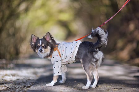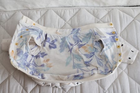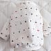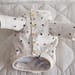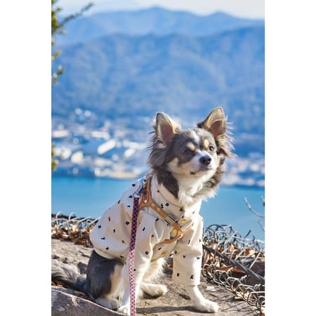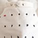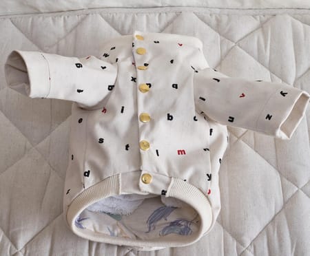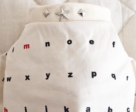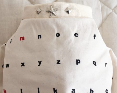 アルファベット11号帆布生地で裏地をつけて作りました。前ボタン式で、ボタンはカシメボタンを打ちつけています。後ろの首のリブに星と四角のスタッズを3つつけています。
