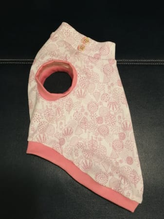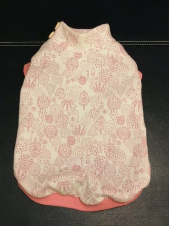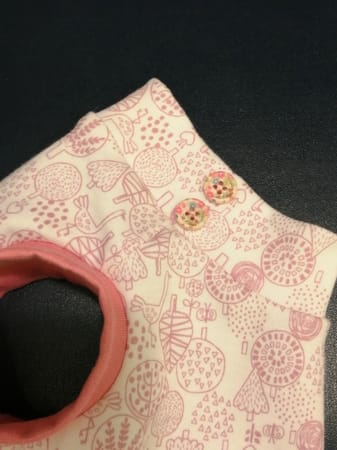 基本のタンクトップの首をアレンジしてハイネックに。そこに飾りボタンを2つ付けて可愛さを足しました!