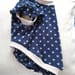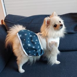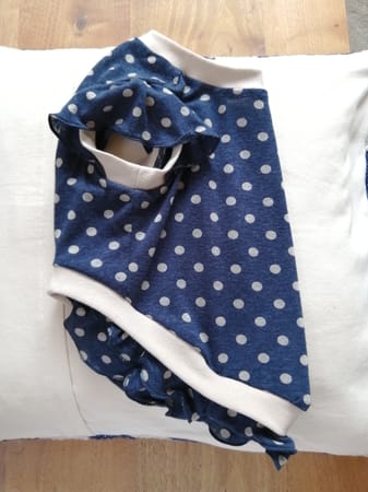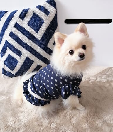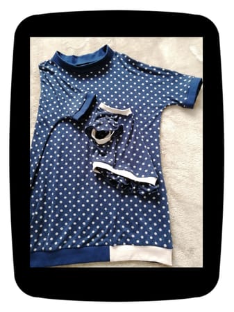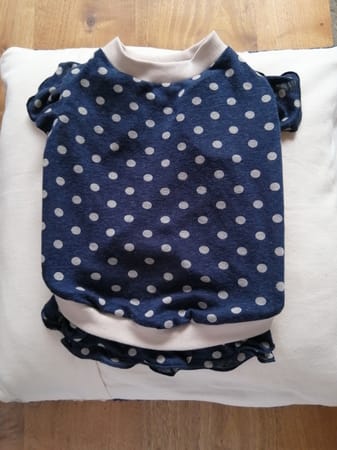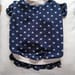 濃紺にベージュのドットというシックな生地でフリル付きタンクトップを作りました。今回はママのチュニックも作ってしまいました。夏のお散歩が楽しみです!