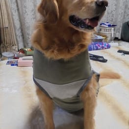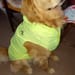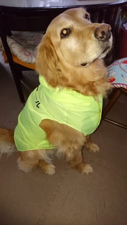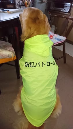 仕事で使っていた防犯パトロールのヤッケを愛犬くうさんのフード付き合羽にリメイクしました。小雨程度の散歩ならこれで十分です。