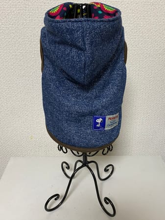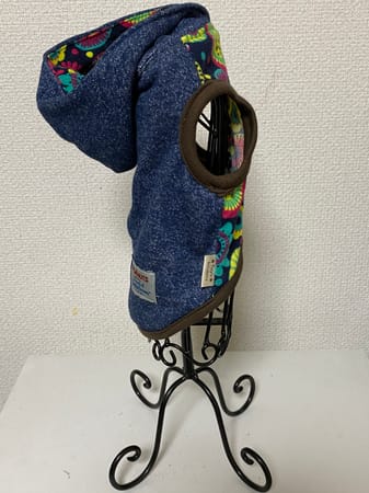 ダイソーで見つけたデニムニット生地。これだけではシンプルなので、手持ちの花柄ニットをお腹部分とパーカー内側に。男の子でもカッコよく着こなせるように作りました。