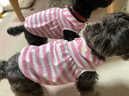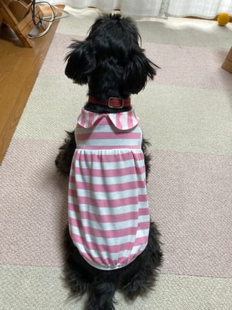 防蚊加工されたクール生地を使用しました。夏のお散歩に最適! 襟元に風船のワンポイントをアイロン接着。
