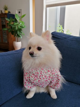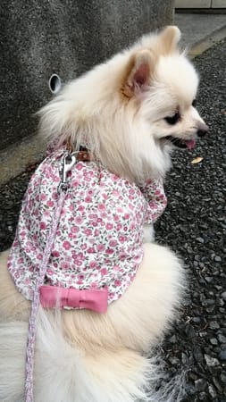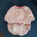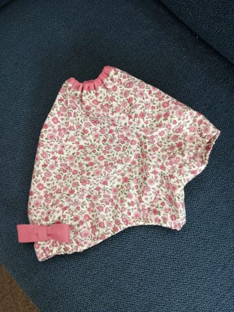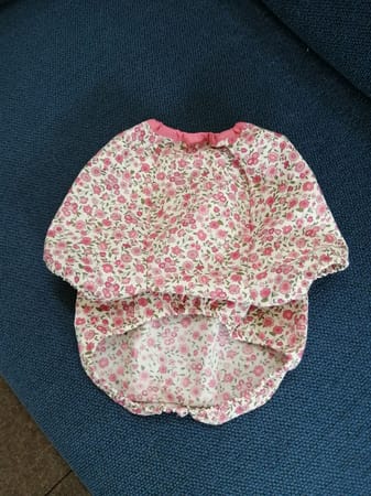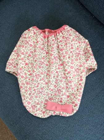 お気に入りの花柄生地でスモックに挑戦。レシピ通りにバイアステープを付けたらなんとか上手くできました!が、うちの子に着せると全く見えません!?