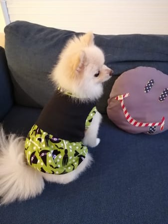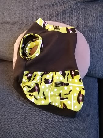 ハロウィンにぴったりな柄のスムースニットが変形で残っていたので、ウエストで切り替えのバルーンスカート部分を継ぎはぎで作りました。ギャザーなのでうまくごまかせたかな?