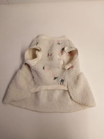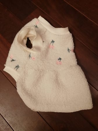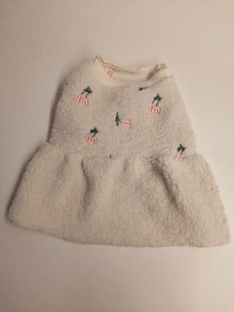 さくらんぼ刺繍のフリースでワンピース。軽くて暖かくて着心地良さそうです。