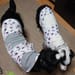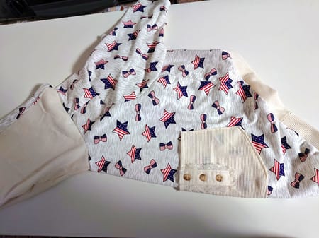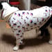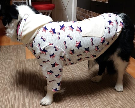 3L(ボーダーコリー2歳17kg)にフードとポケット、袖を付け、フード、ポケット、ボタン部分はいらなくなった自分の服を再利用しました。