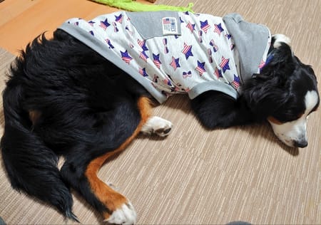 無料タンクトップ5L(バーニーズ8ヶ月26kg)にフード、ポケット(タグを付け、ワンポイント)。
