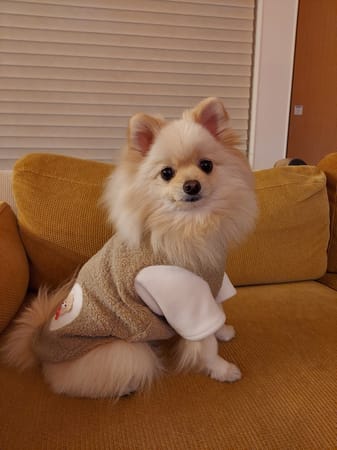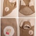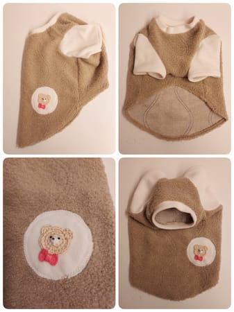 冬のお散歩用に暖か素材で作りました。くまさんモチーフを付けたらベビー服みたいになりました。
