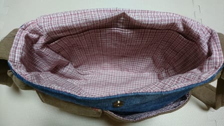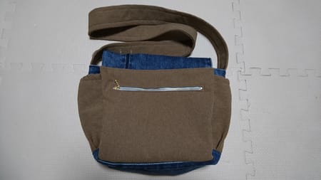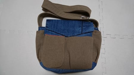 マグネットボタンで開閉できる蓋を付けて中を見えなくした、ジーンズとパンツのリメイクのお散歩バッグです。5個目になりました。コツがわかり早く作れるようになってきました。