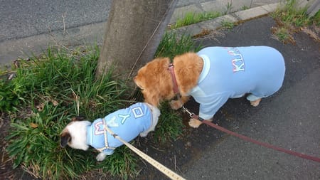 5Lサイズのヒーローコスチュームを作った端切れで小型犬のTシャツを作りました。見た目が同じデザインになるように工夫しました。