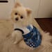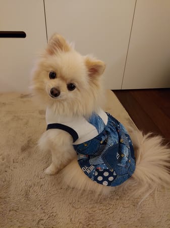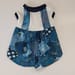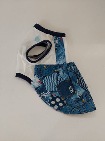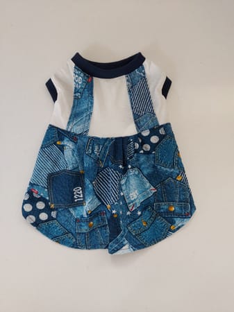 デニムのポケット柄リップル生地でサスペンダー付きスカートみたいな服を作りました。白の身頃部分はアイスコットンというひんやり生地で夏にピッタリです!