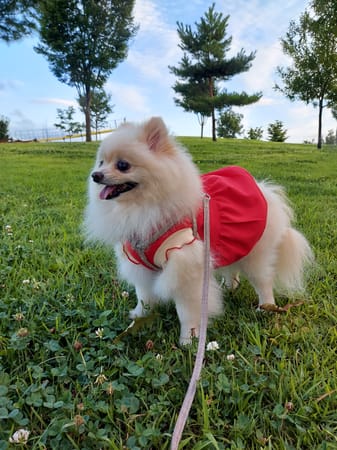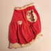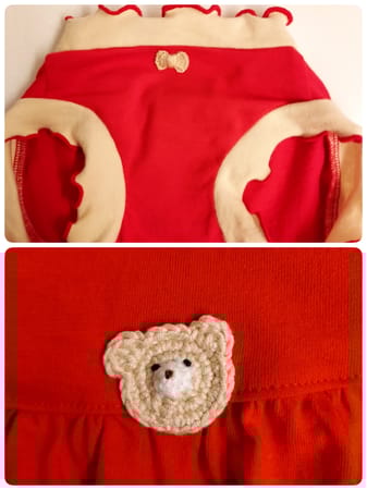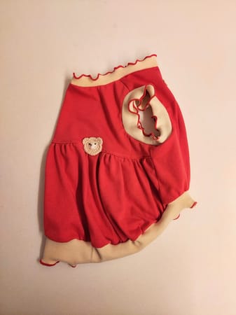 真っ赤なバルーンワンピース。リブはベージュにして赤糸で巻きロックでフリル風にしました。 防蚊加工生地なので草のたくさんある公園のお散歩も安心です。