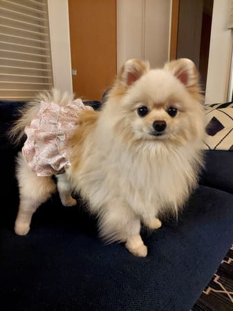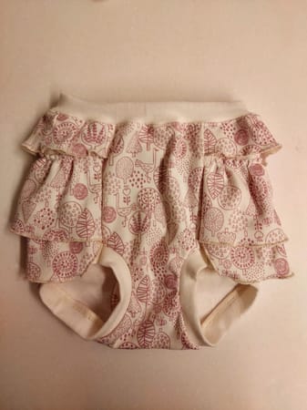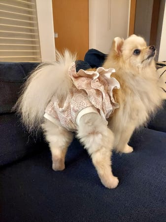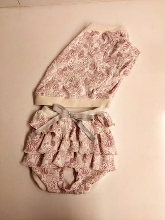 前に作ったトップスの生地があったので、ドッグカフェ用に初めてマナーパンツを作ってみました。次はフリルの間隔としっぽ穴を少し修正したいと思います。