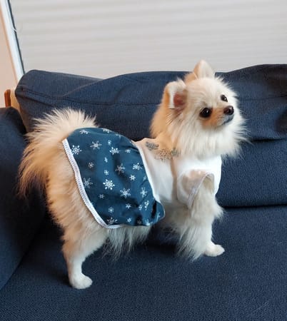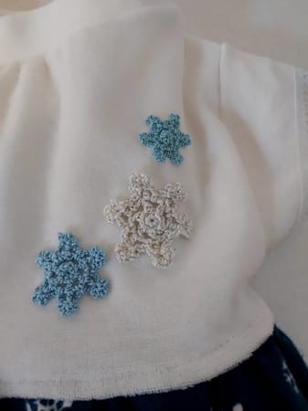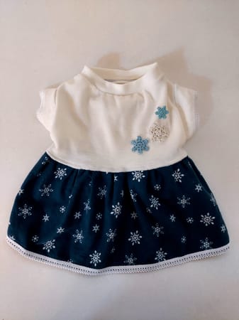 冬服。雪の結晶の柄のネル素材と暖かなマイクロフリースを使いました。雪の結晶のモチーフとストレッチレースで可愛く仕上げました。
