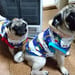 お友達ワンコ兄妹へのプレゼントです。同じ生地を使用し、リブの色を変えて、男の子、女の子にしました。
