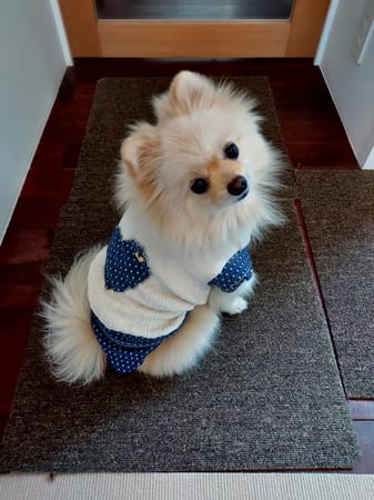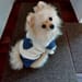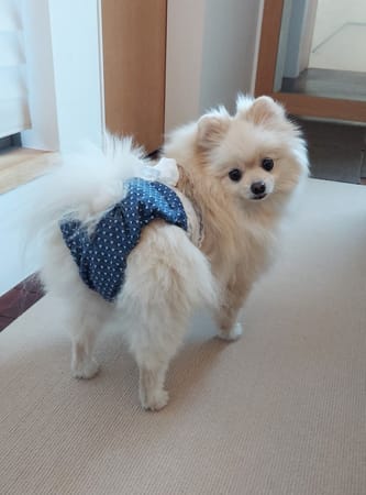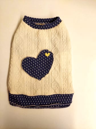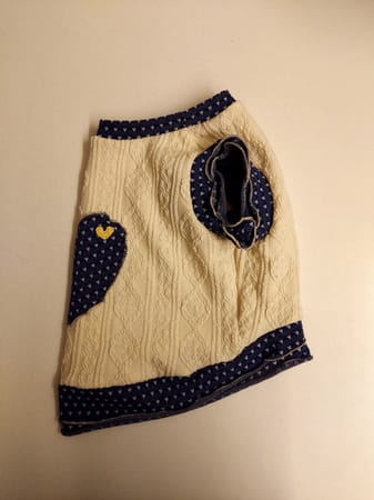 細かいハート柄の生地を使い大きなハートに小さな黄色いハートを縫い付けてポイントに!同じ生地でマナーパンツも作ってみました。マナーパンツは自己流で着けやすく試行錯誤してウエストを幅広のストレッチレースで縛るタイプにしました。