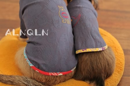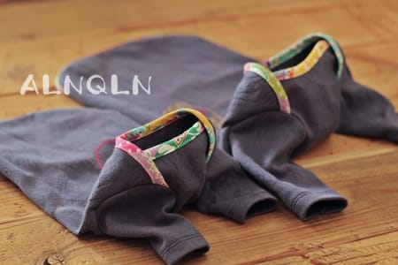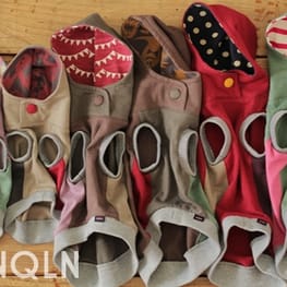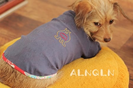 モンスター柄のジャガード生地に、ビンテージフィードサックでパイピングをしました。