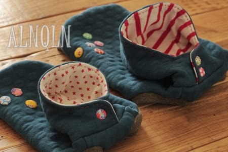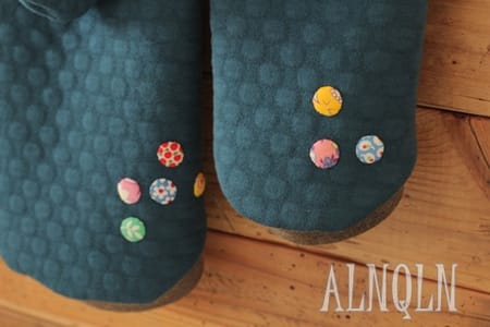 キルト生地のドット柄に合わせてフィードサックで小さな丸を作り、