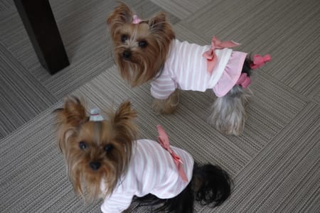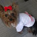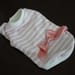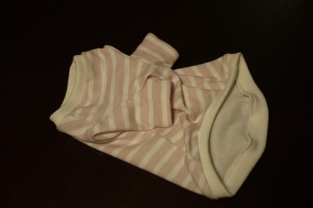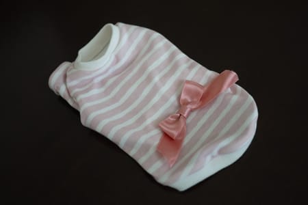 ベイシックTシャツをピンクのボーダー柄の綿ニットで作りました。ピンクの大きめのリボンがアクセントです。