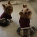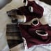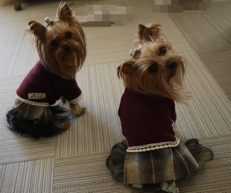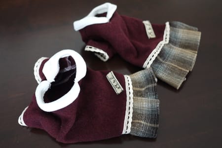 私が気に入っていた自分のえんじ色のセーターとチェックのウールスカートをワン用にリメイクしました。セーター生地なので暖かく着やすいものができました。レース飾りとワンコ姉妹のイニシャルタグがアクセントです。