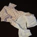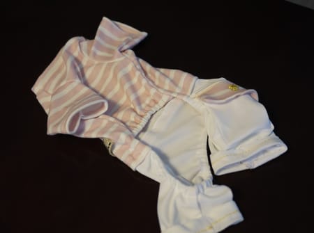 トップスはピンクのボーダー柄でコットンニット、ズボンはジャージ生地で伸縮性が高く、活動しやすいものにしました。
