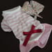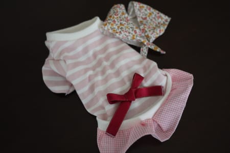 春らしい薄手のコットンニットのトップスにチェックのスカートを付け、アクセントに赤いリボンを飾りました。花柄のスカーフは取り外しできるので、2wayで使えます。スカーフが外れないように方に目立たないよう遠し糸をつけてあります。