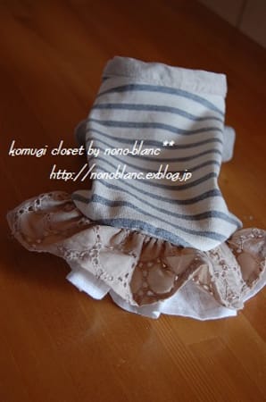 ショールカーデのパターンにふりふりのスカートをつけました ホワイトリネンとサークルレースで