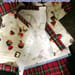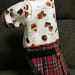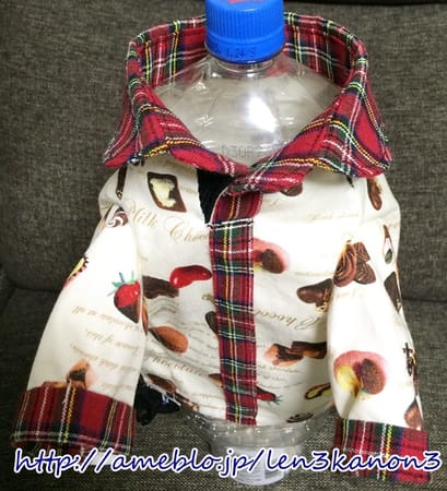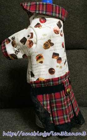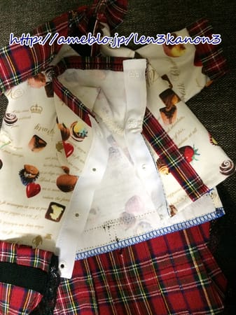 チェックのスカートをつけて、横開きのシャツを作りました。