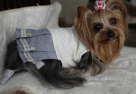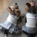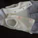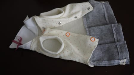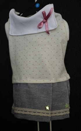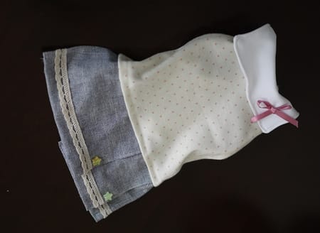 セーラーカラーのつなぎとお揃いになるスカートバージョンです。スカートにはレースのラインを縫い付け、セーラーイメージを高めました。前開きなので着脱しやすいです。