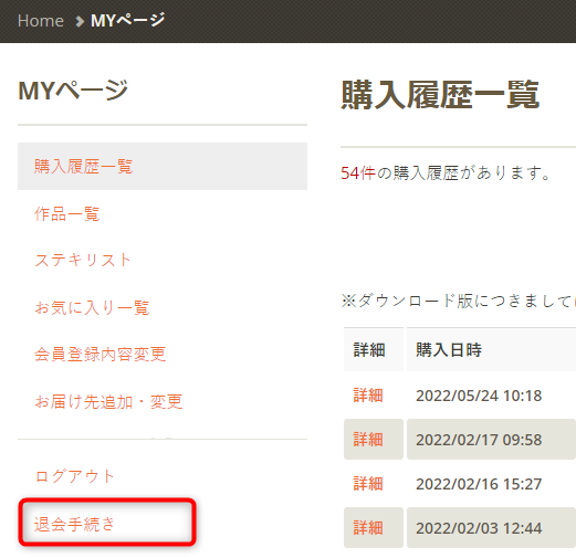 退会につきましては、マイページにログイン後にメニューの「退会手続き」より退会が可能です。