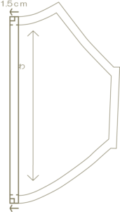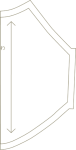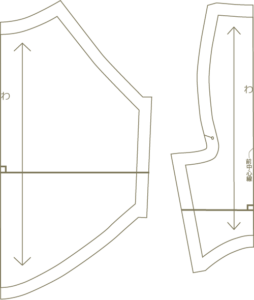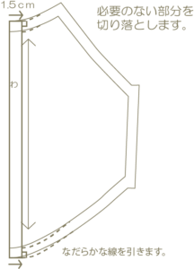 | わで裁つ線 | 生地を二つ折りにしたときの折り目を「わ」と言います。裁断の際は、生地の「わ」と型紙の「わ」を合わせます。 | |