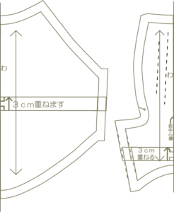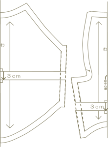 3cm短くする場合は、身頃の下半分を3cm上にずらし、脇線をつなげます(点線部分)。