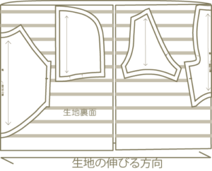 ニット生地は縦より横によく伸びます。型紙の地の目線が布の縦糸と平行になるように配置すると、胴まわりが伸びて着やすくなります。
